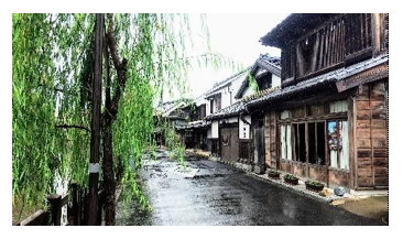 「交流館」を出ると、小野川に沿った佐原の町並みを歩きました。雨が降っていましたが、柳の木が雨とマッチして江戸情緒のある、しっとりとしたいい眺めが見られまし