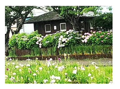 午後は、「水郷潮来あやめ園」に行きました。「あやめまつり」は2日前に終わっていて、あやめの全盛期は少し 過ぎていましたが、雨の中のあやめとアジサイはつややかな美しさがありました。また、わたくしたち以外の観光客はいませんでしたので、貸し切り状態でした。 |