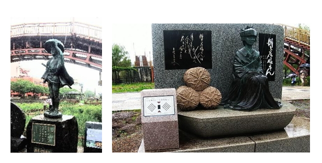 さらに「あやめ園」の中には「潮来笠記念碑」と「潮来花嫁さん記念碑」がありました。特にそこでは、歌手の橋幸夫さんの「潮来笠」と花村菊江さんの「潮来花嫁さん」の曲を聴くことができました。 |